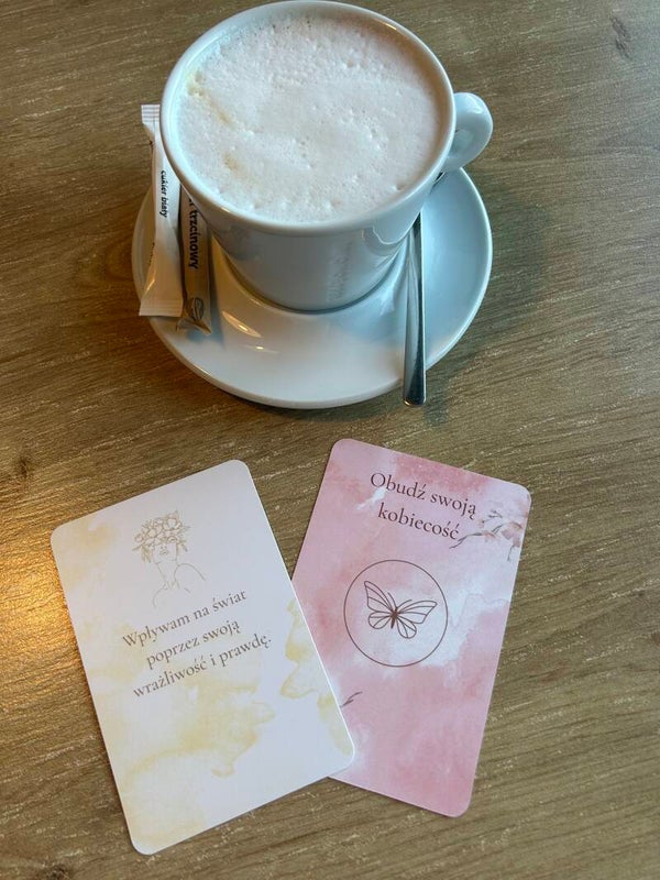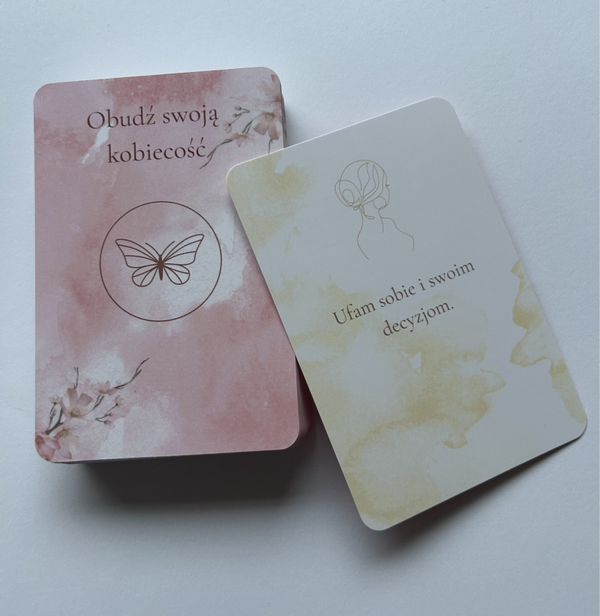 Każda karta niesie spokojne przypomnienie o kobiecej obecności, zaufaniu do ciała, kreatywności i ciepłej relacji z sobą. Możesz korzystać z nich na co dzień, bądź w praktyce uważności, podczas pisania lub po prostu trzymać je blisko siebie w momentach, kiedy potrzebujesz zakotwiczenia i czułego wsparcia.