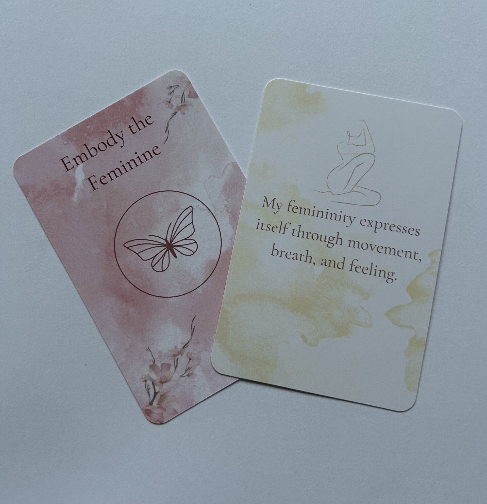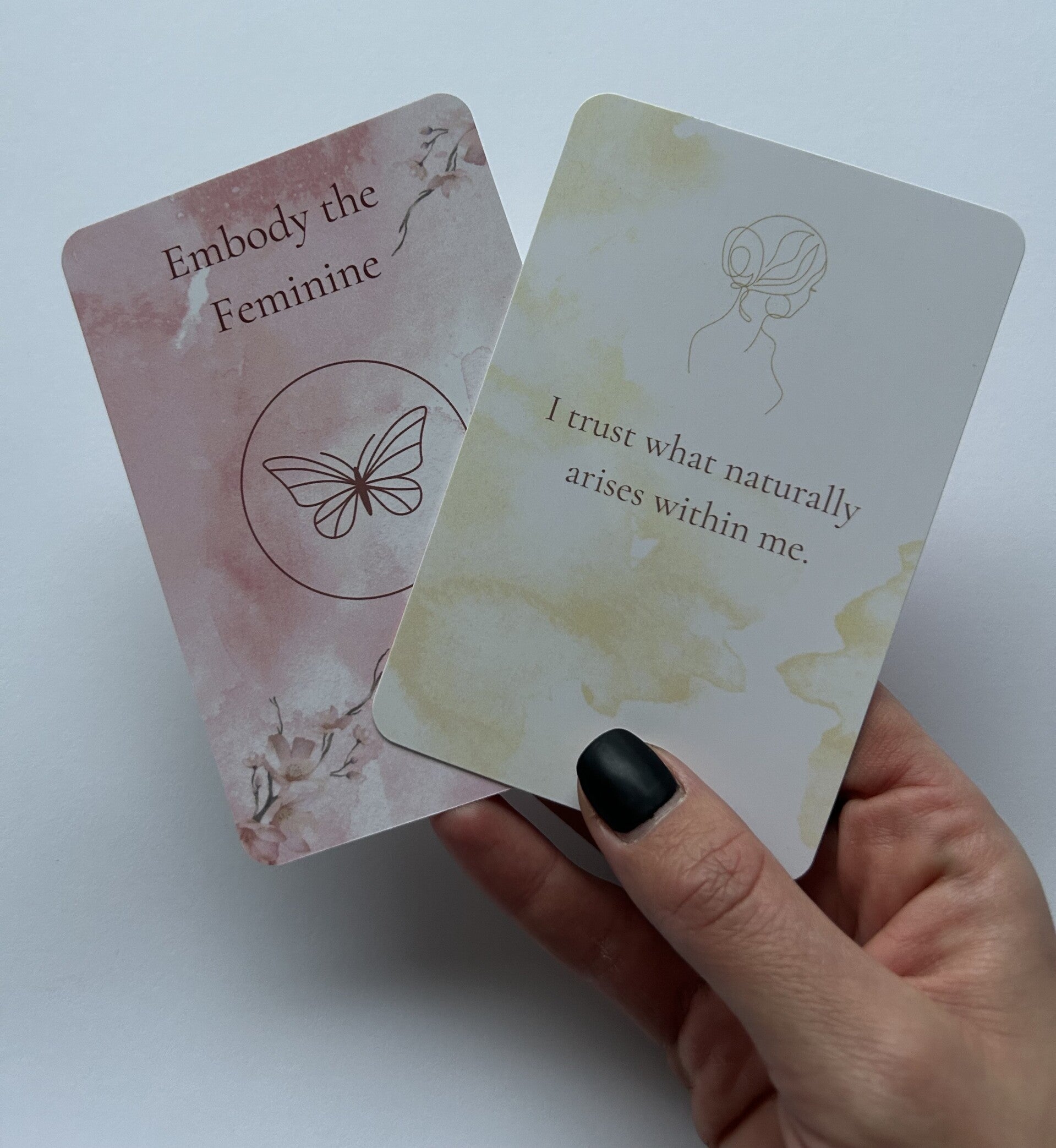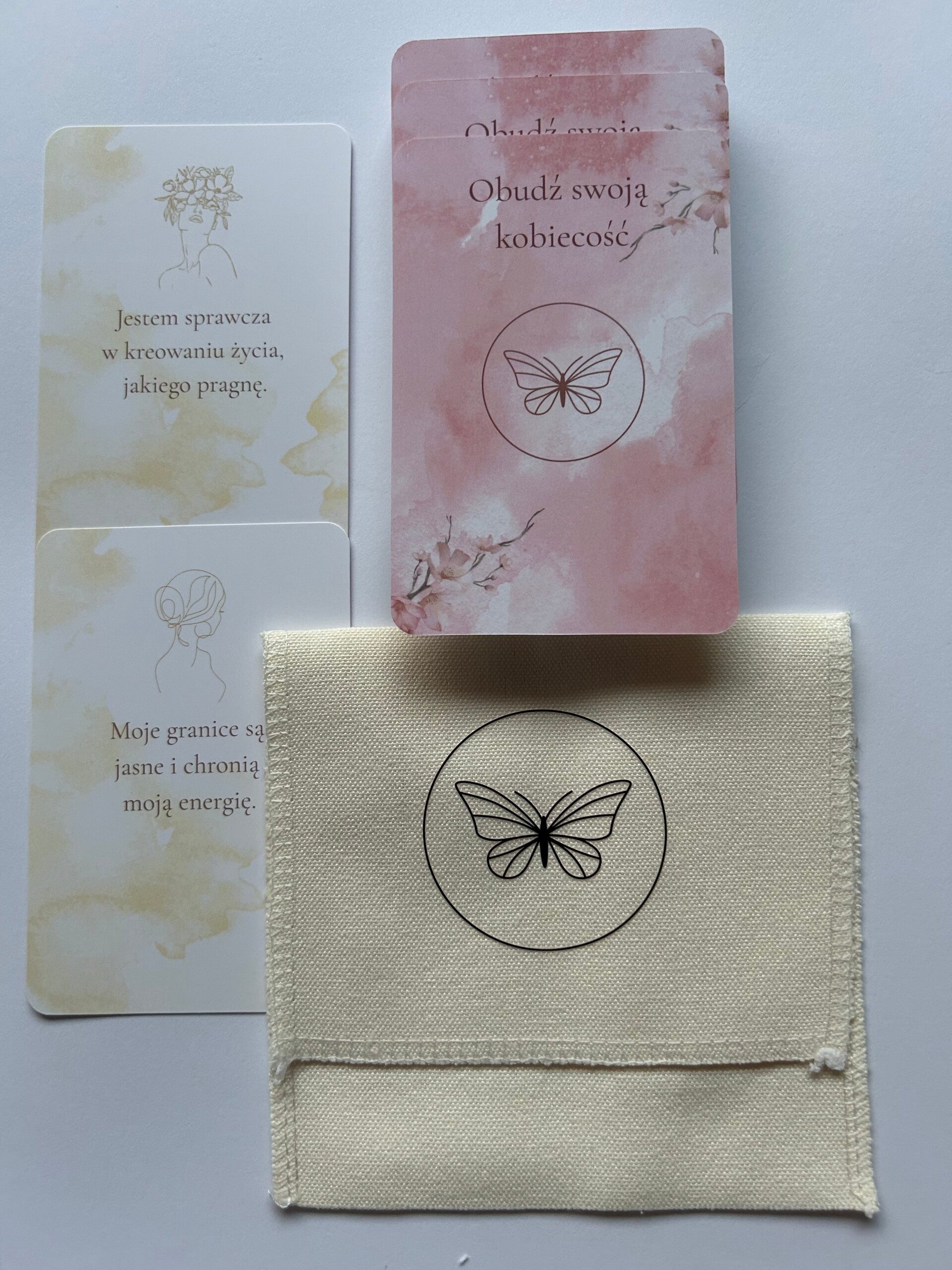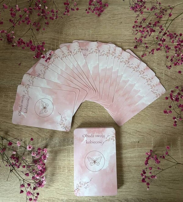 Pobudź swoją kobiecość - to delikatny zestaw kart afirmacyjnych, stworzony jako zaproszenie do powrotu do siebie — do ciała, do obecności, do wewnętrznego czucia.